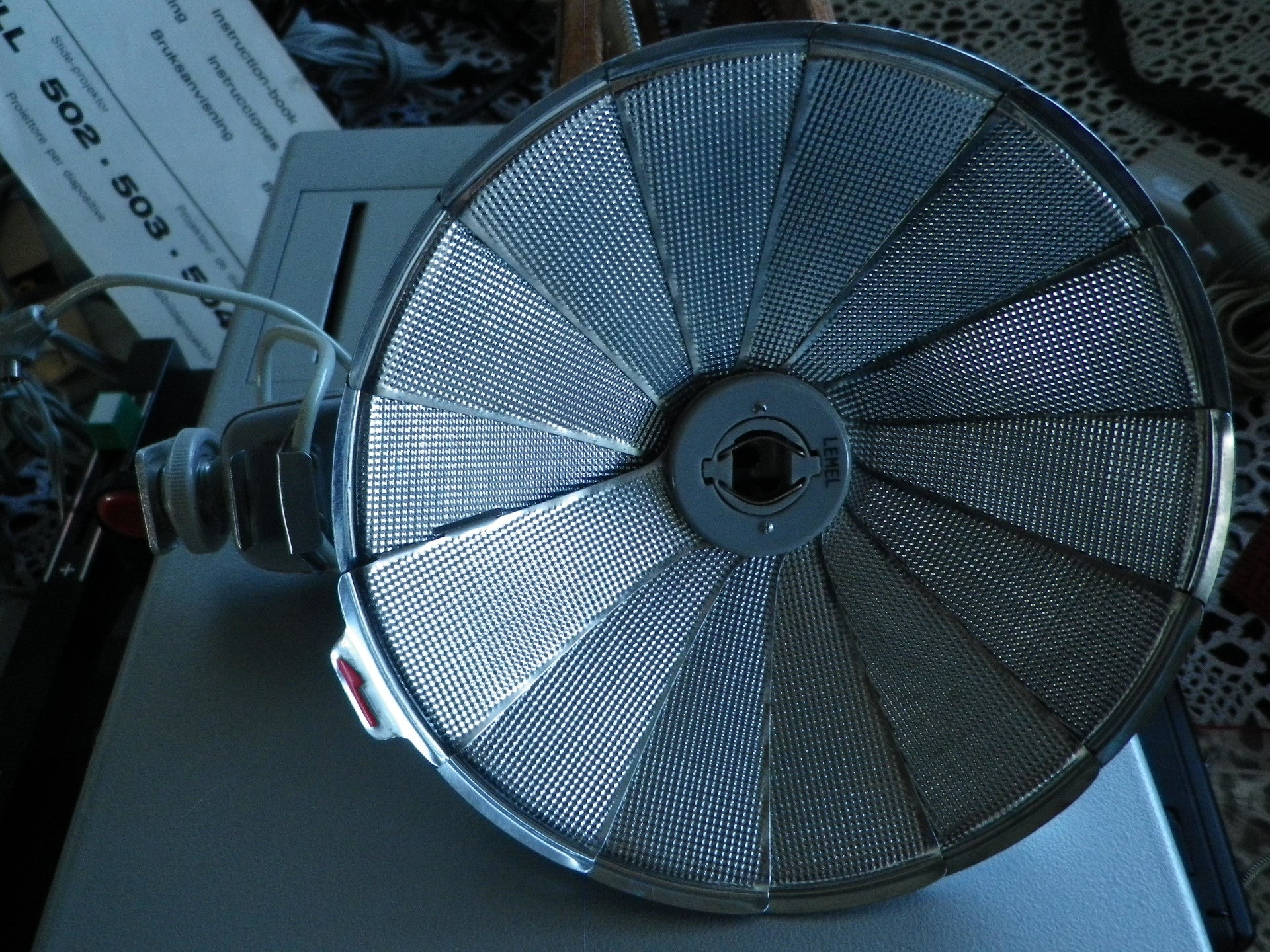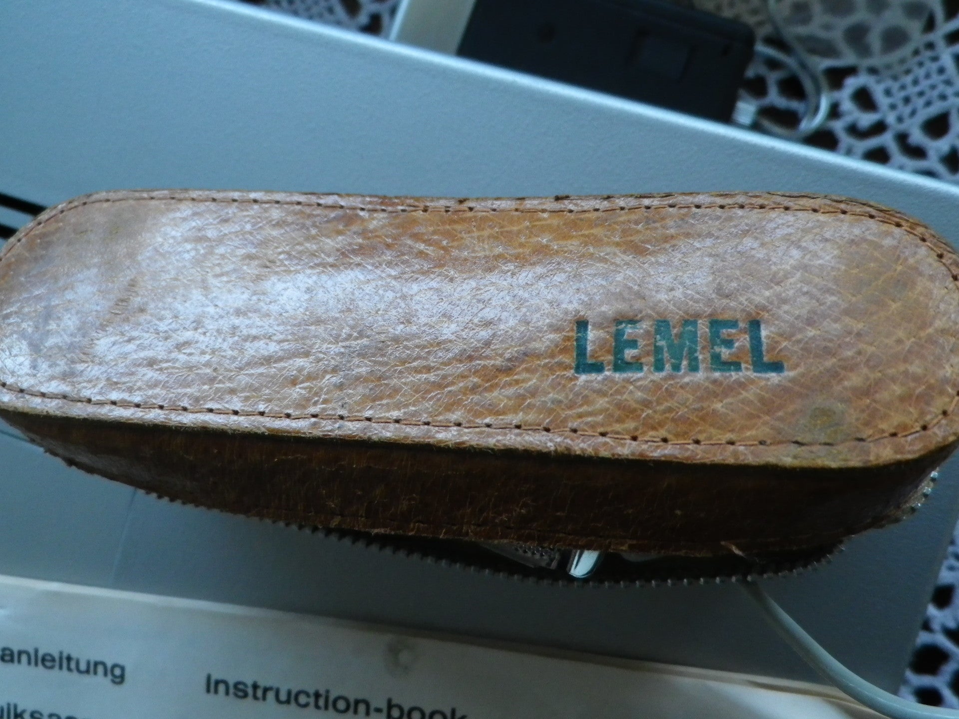 A flash device with the brand name Lemel "Golden Line" Pocket Flash Gun manufactured in Japan.A gray plastic housing with a fold-out reflector that consists of 14 slats.A fitting for plug-in flashlightsLeather pouch