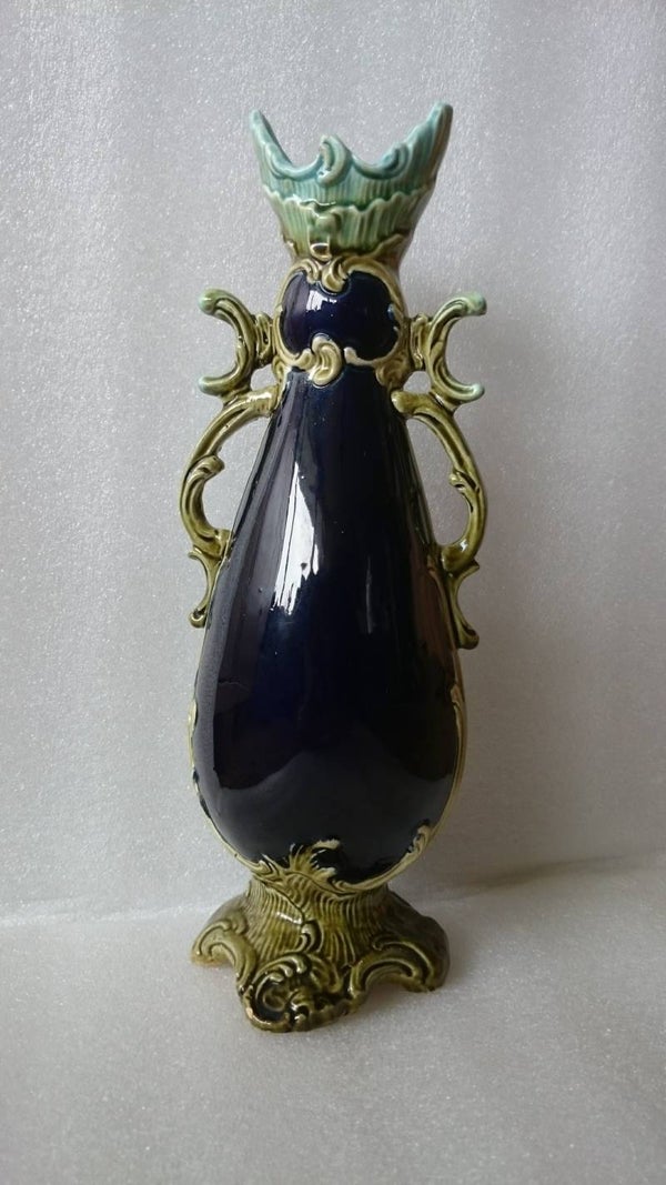 Beautiful vase in cobalt blueFloral motif with golden accents here and thereClear signature on the bottomApproximately 27 cm high