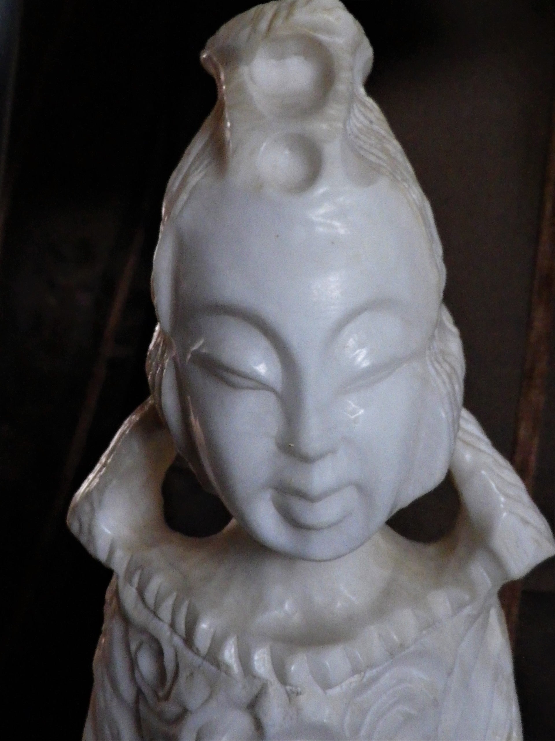Figure of an Asian woman beautifully carved in white alabaster with round, dark alabaster, base below.