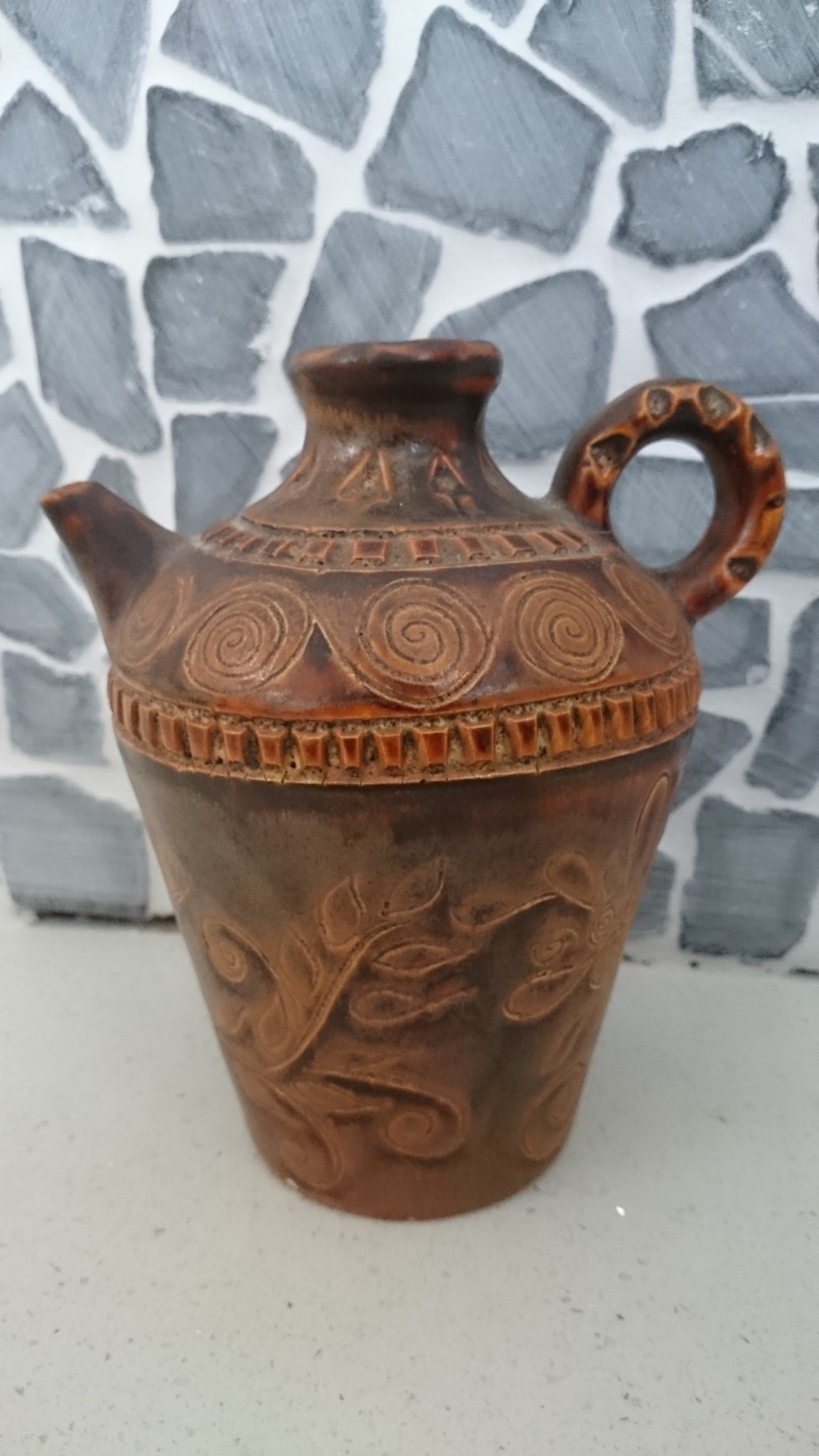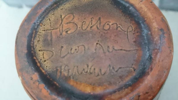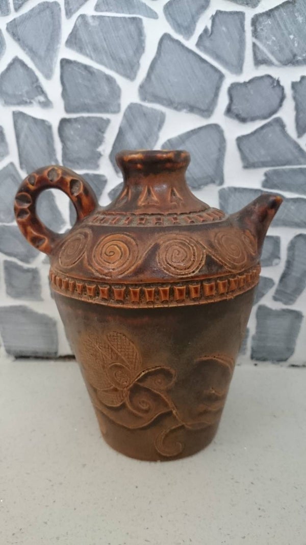 Unique jug made by Marius & Huguette BessoneSgraffito, a separate method for decorating ceramicsVery richly crafted and beautiful colorJug is 17 cm high